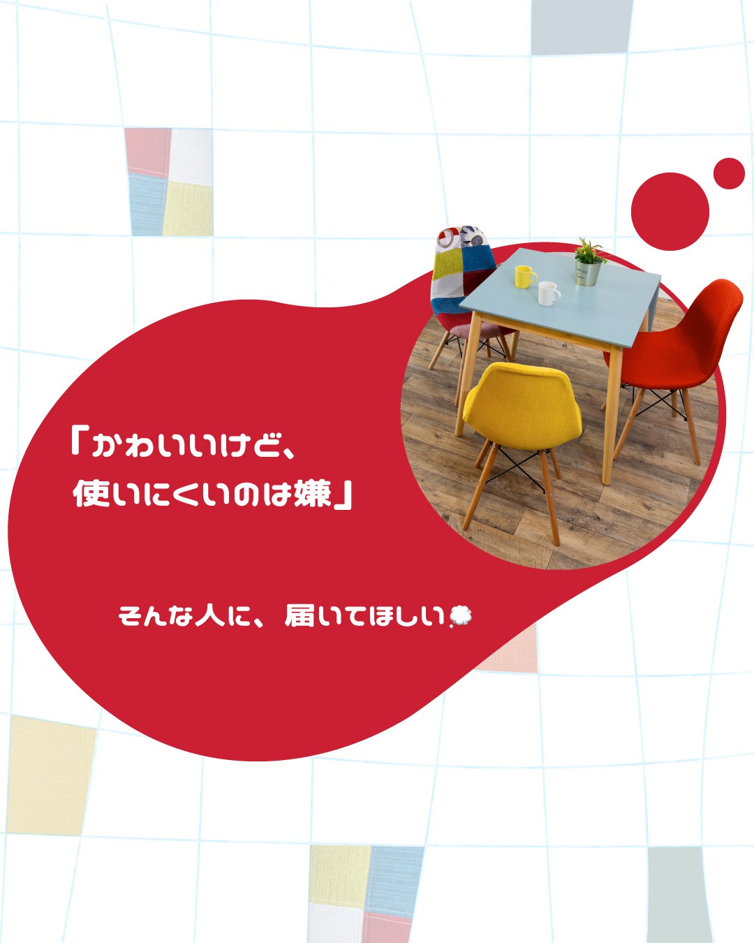 カラフルなファブリックを組み合わせたデザインは、